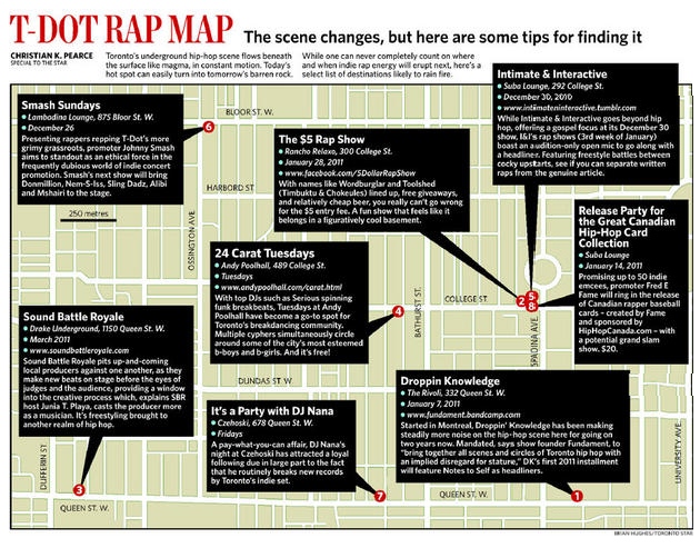 Shout to the homegirl, Tonika on getting a shout in the article for her Sound Battle Royale showcase battles. but they shoulda included DJ Scuff‘s excellent Local Sounds hip-hop showcase/parties on the map below too:
